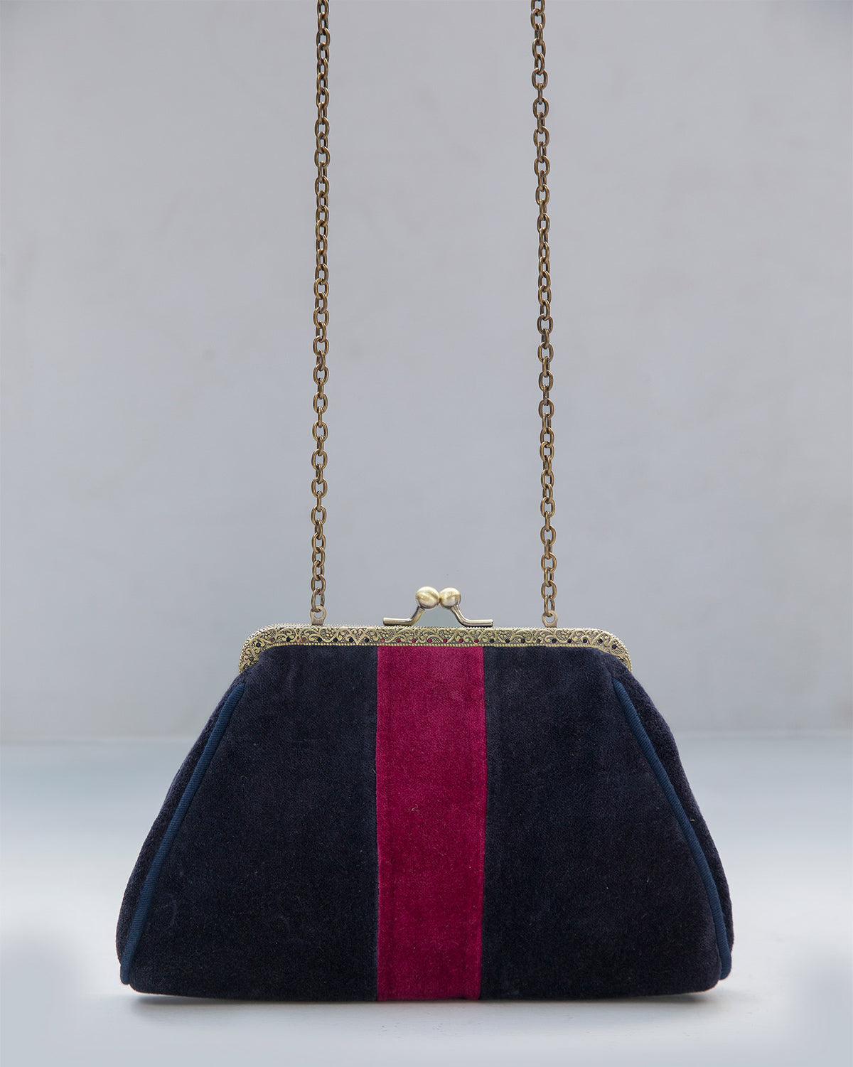 - Fasioned in velvet, our navy and berry Romani Clutch comes with antique brass clasps