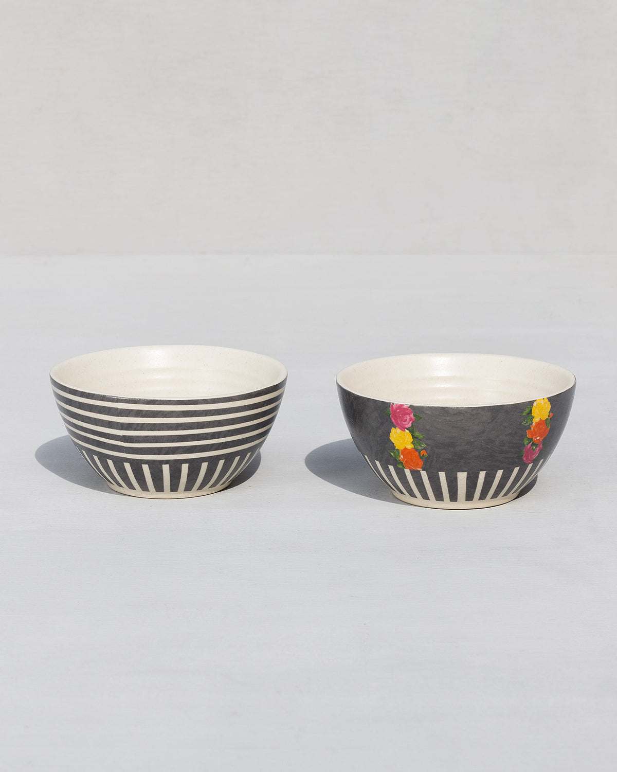- A monochrome palette paired with a hint of floral motifs, these bowls are the perfect serving dish for little nibbles.