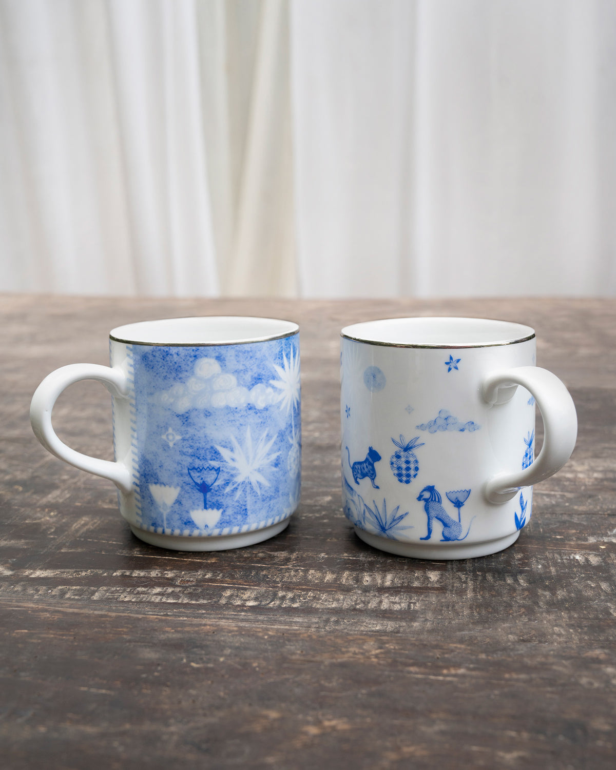 - A set of two mugs in icy blue & white, a pure form of whimsy featuring stylised flora and fauna of the Himalayas
