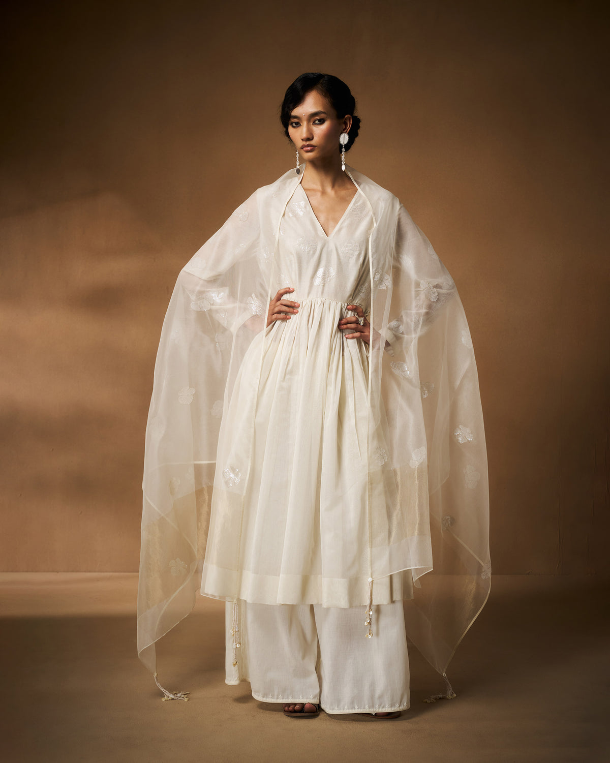 - The soft, neutral palette of ivory accentuates the intricate craftsmanship of the embroidery, creating a harmonious interplay of texture and tone.