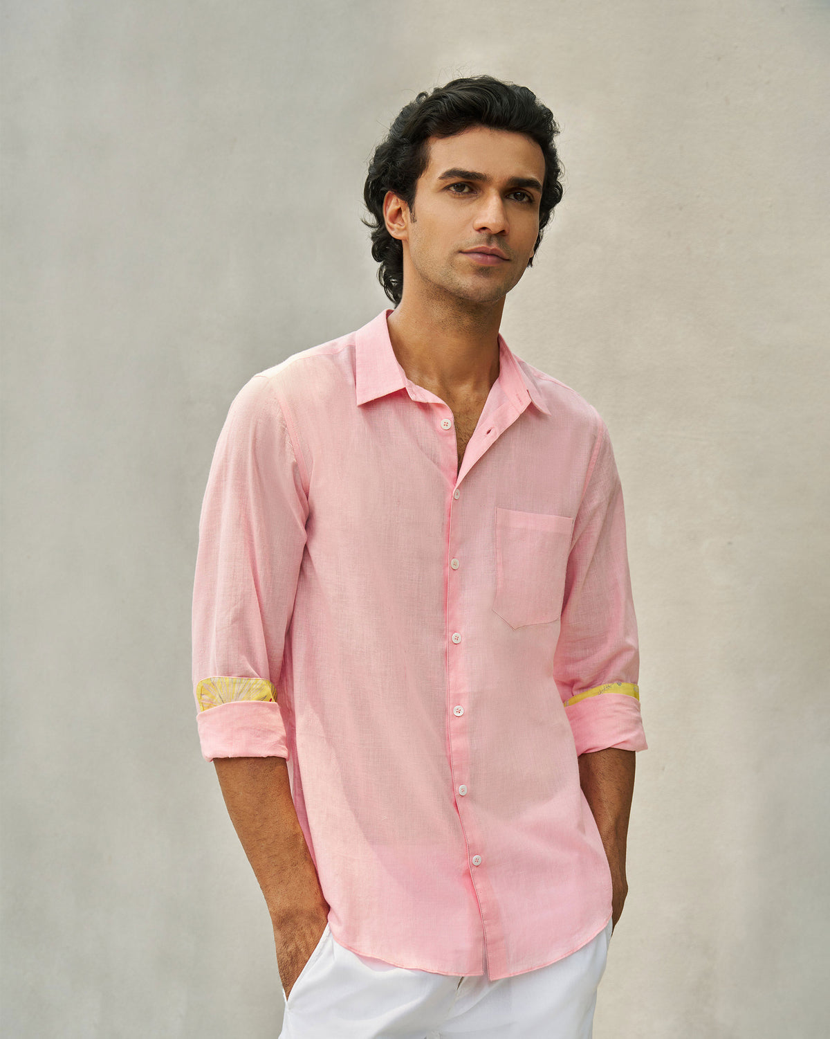 - The Sankara Shirt is a bold, pink highlighted with yellow selvedge detail that makes an effortless statement.