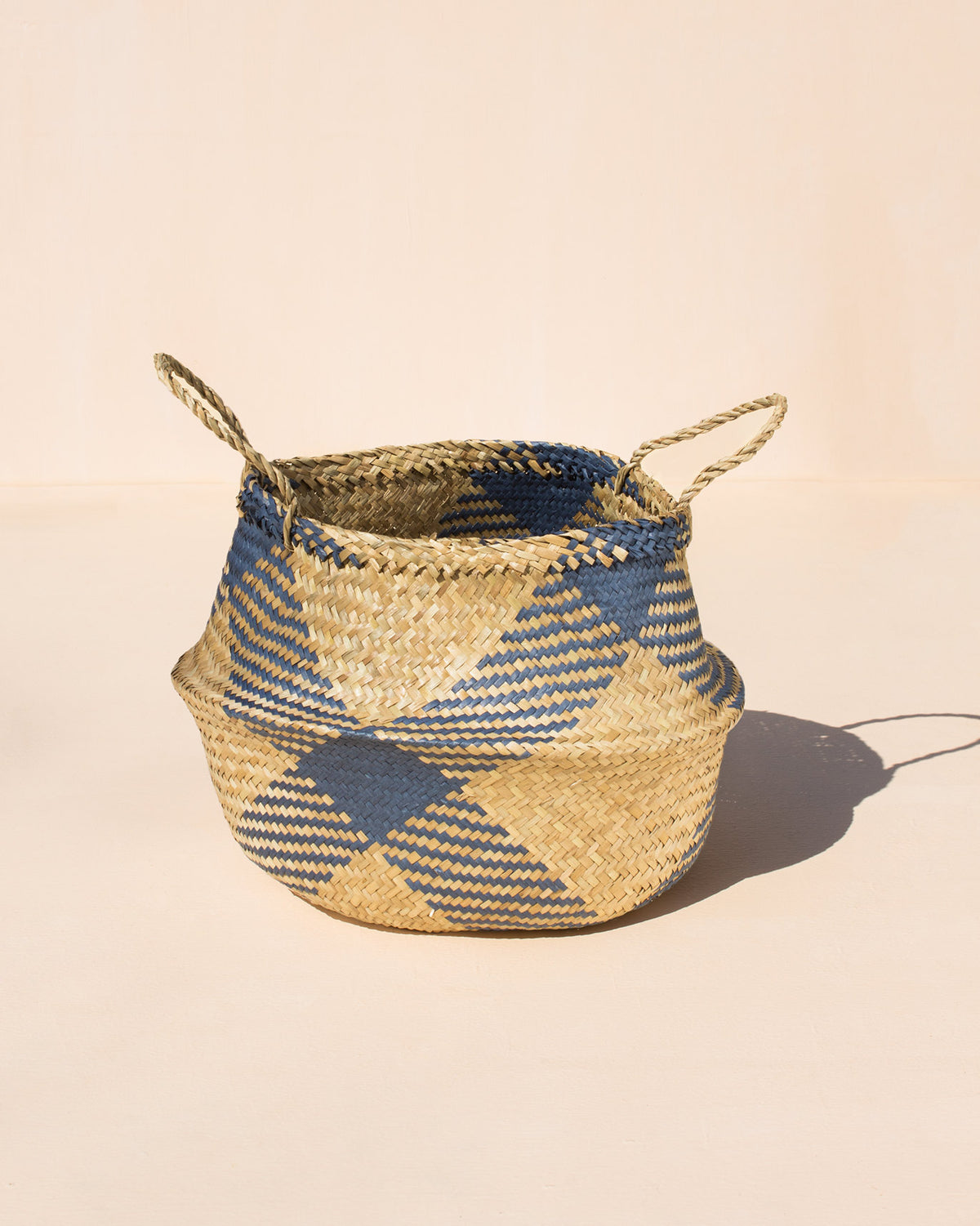 - Crafted in a natural fibre, the blue pattern on this basket is insipred by the prints on the makeshift homes of the Banjara community