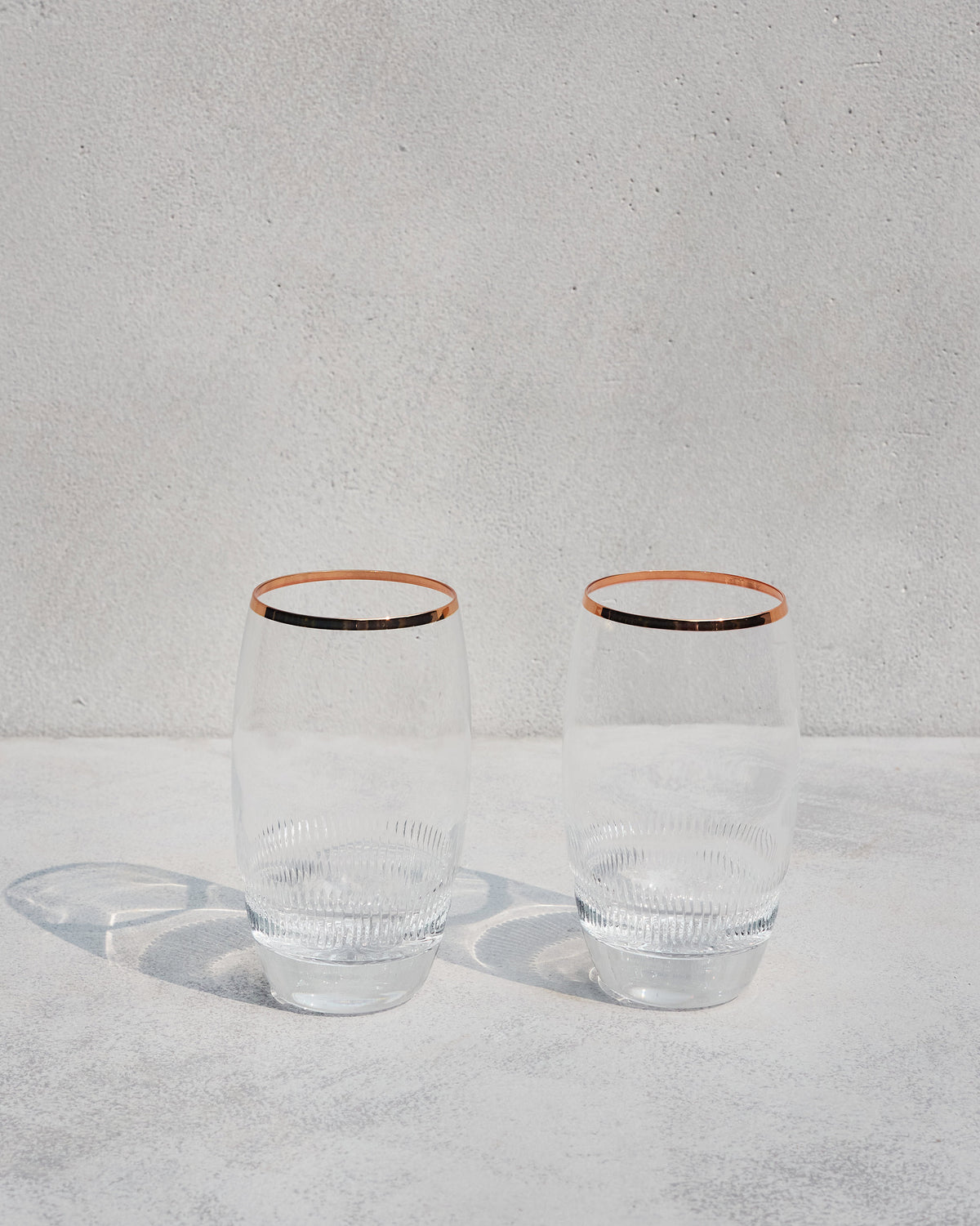 - This set of 4 glasses is crafted from glass and features a contemporary design and gleaming copper rim.