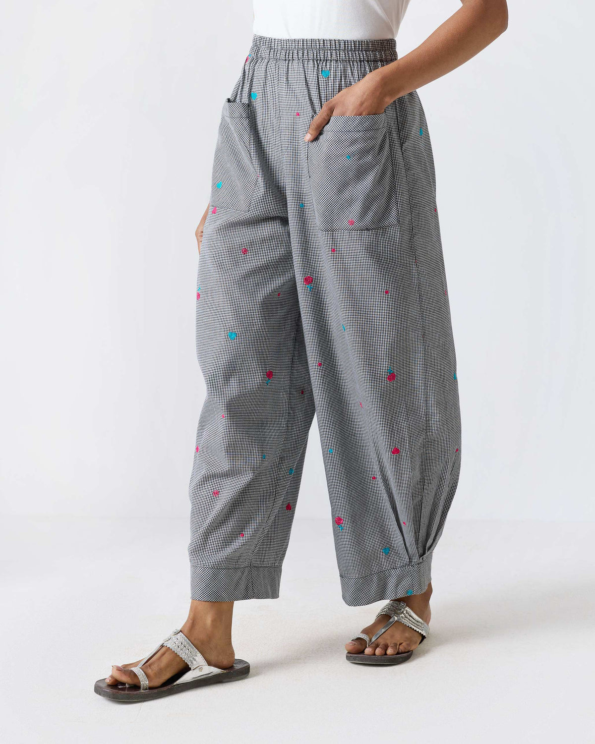 - A versatile and functional cotton-linen piece to style, these pants offer a perfect balance of elegance and comfort. Made from 100% cotton, the pants feature delicate tiny checks all over.