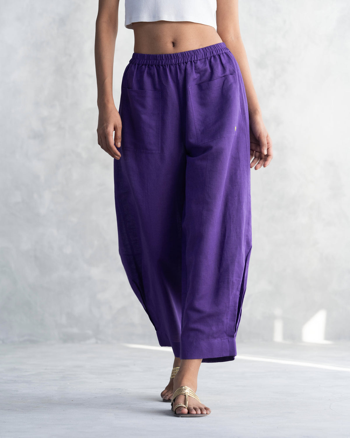 • Form meets function, these purple pants feature two convenient patch pockets in the front, providing both practicality and a touch of flair.