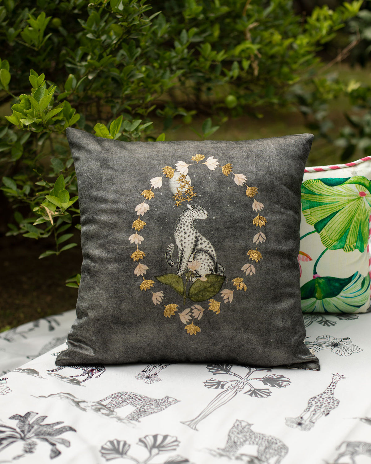 • A monochromatic cushion with motifs inspired by the flora & fauna found along India's Malabar coast