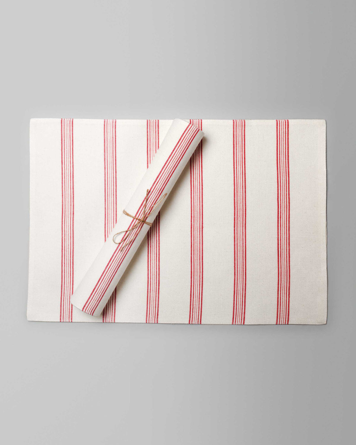 - A neat ivory placemat with red stripes makes a cool, minimal serving option for your table setting