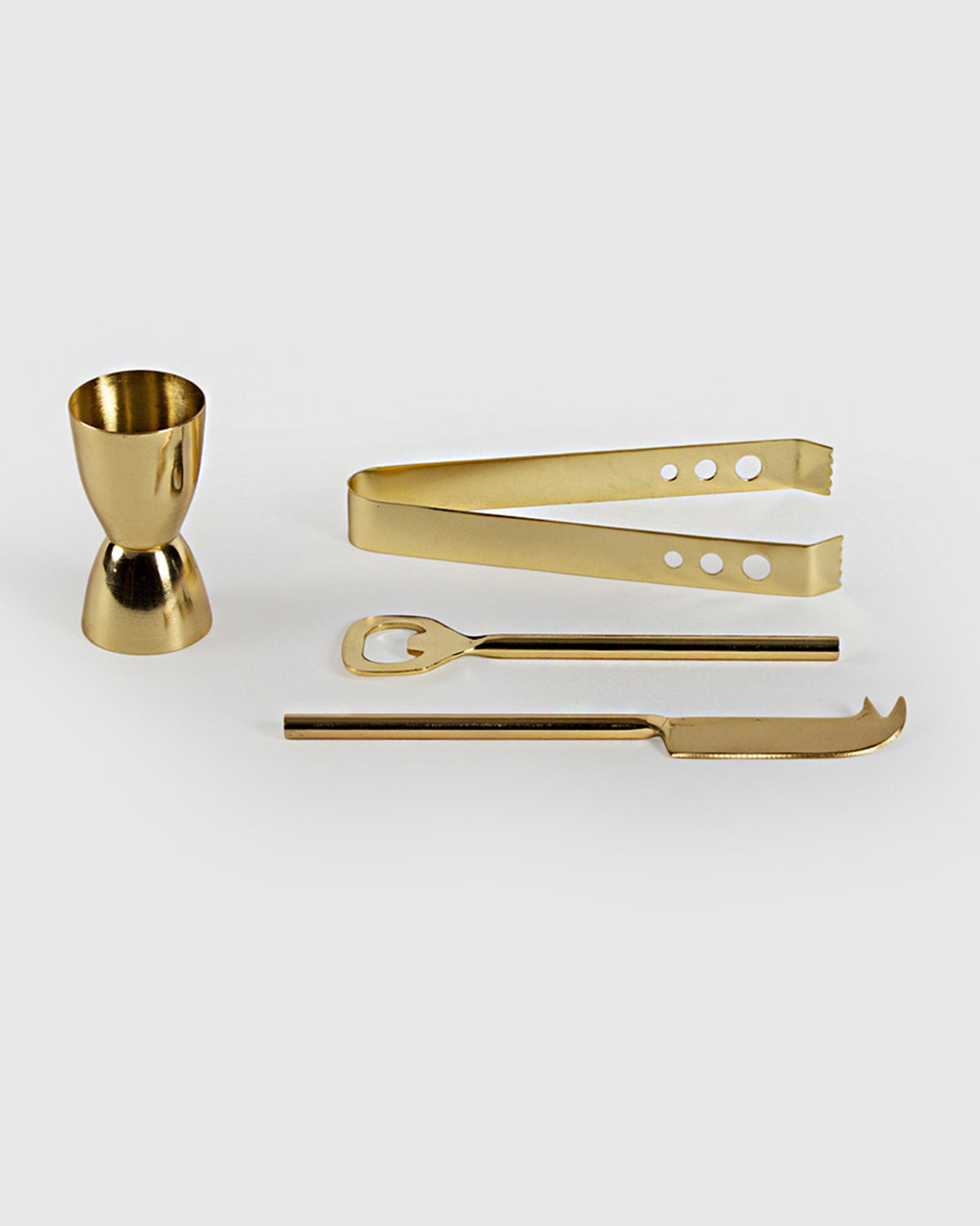 - Made of stainless steel with a shiny brass finish, this includes a peg measurer, ice picker, knife, and bottle opener