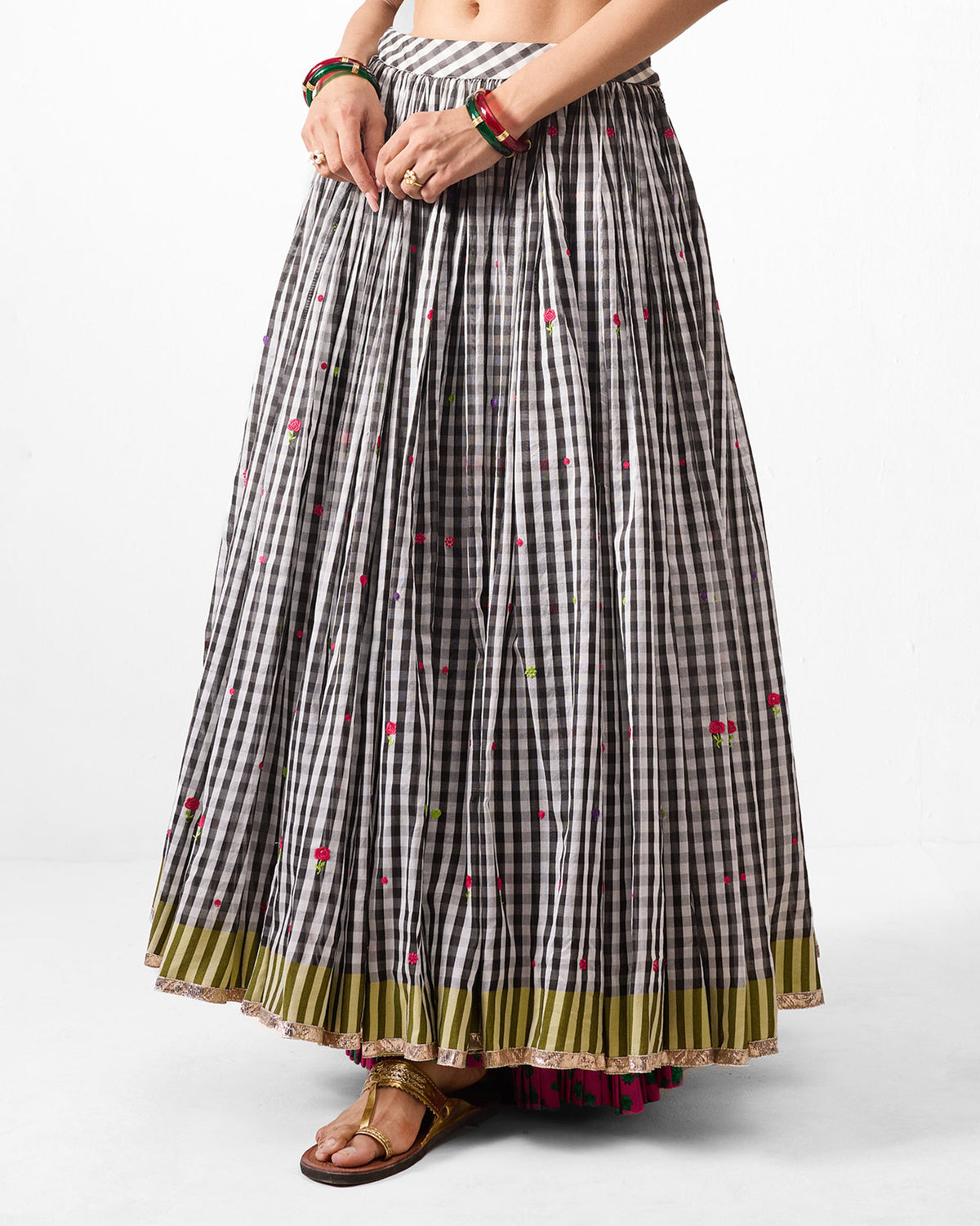 - The Sitara Skirt is a black and white piece in cotton silk chanderi, featuring checks with all-over playful nico embroidery. The look is elevated with a pleated fuchsia frill peeking subtly from the hem adding a playful contrast. It includes tassel details at the dori ends, adding a touch of charm and character.