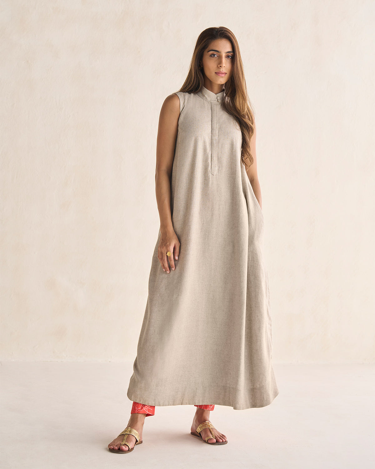 Sleeveless High Neck Kurta - Natural