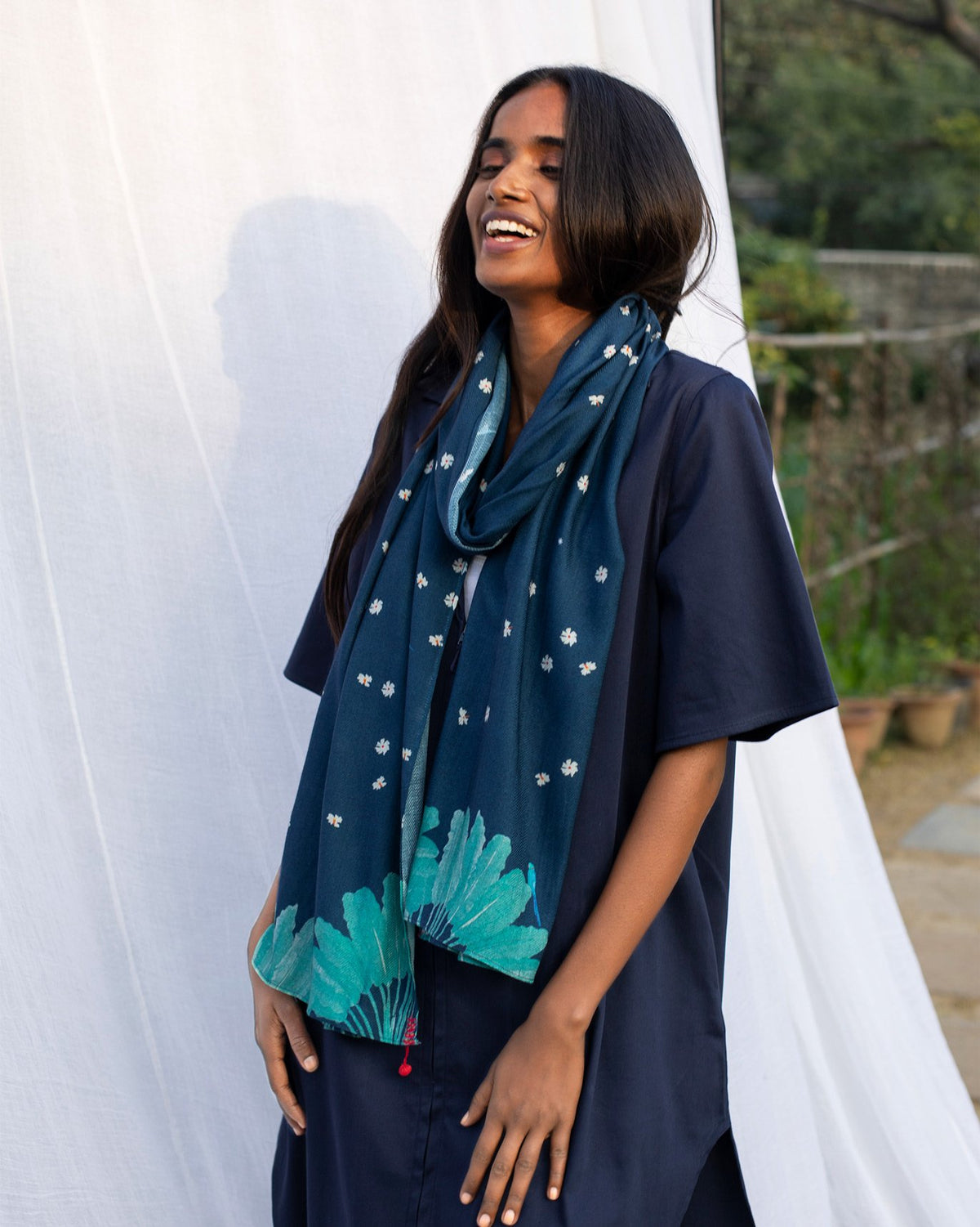 - A scarf featuring a fascinating print inspired by the night-blooming harsingar flowers fallen on the ground