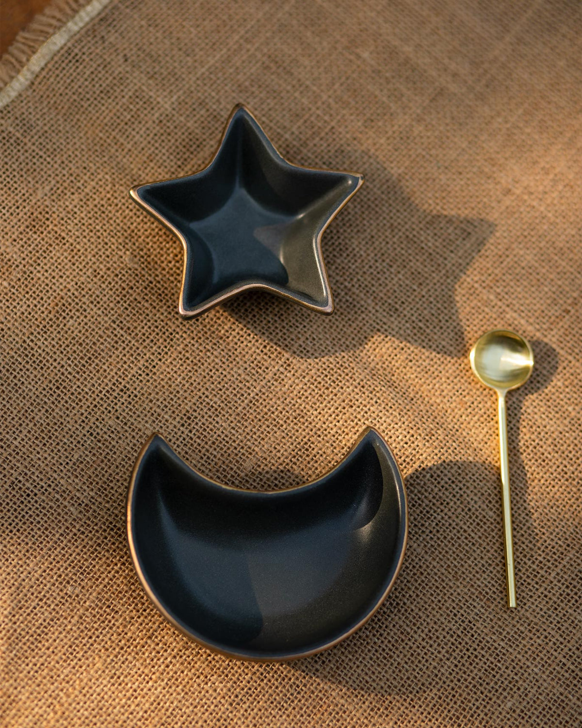 two trinket dishes is shaped after the moon and stars - The set also includes a little golden spoon