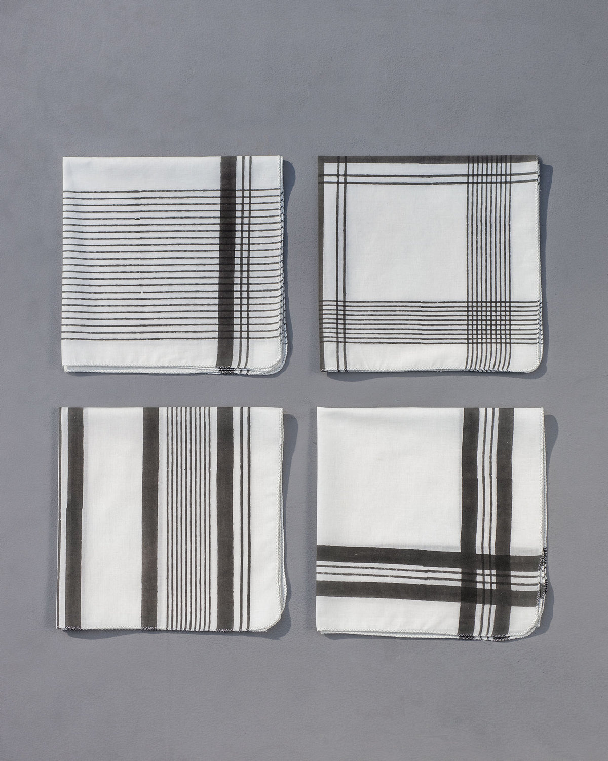 - A set of four napkins, indivudually block printed with distinct black and white check patterns, and edged with silver zari