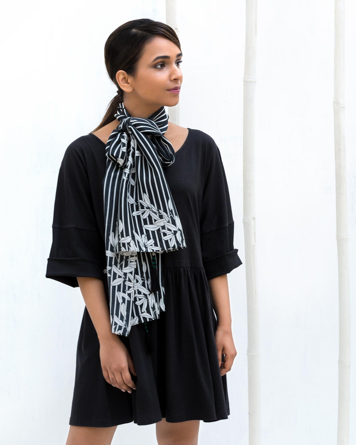 - With a soft handfeel, narrow stripes and a leaf motif grace this scarf