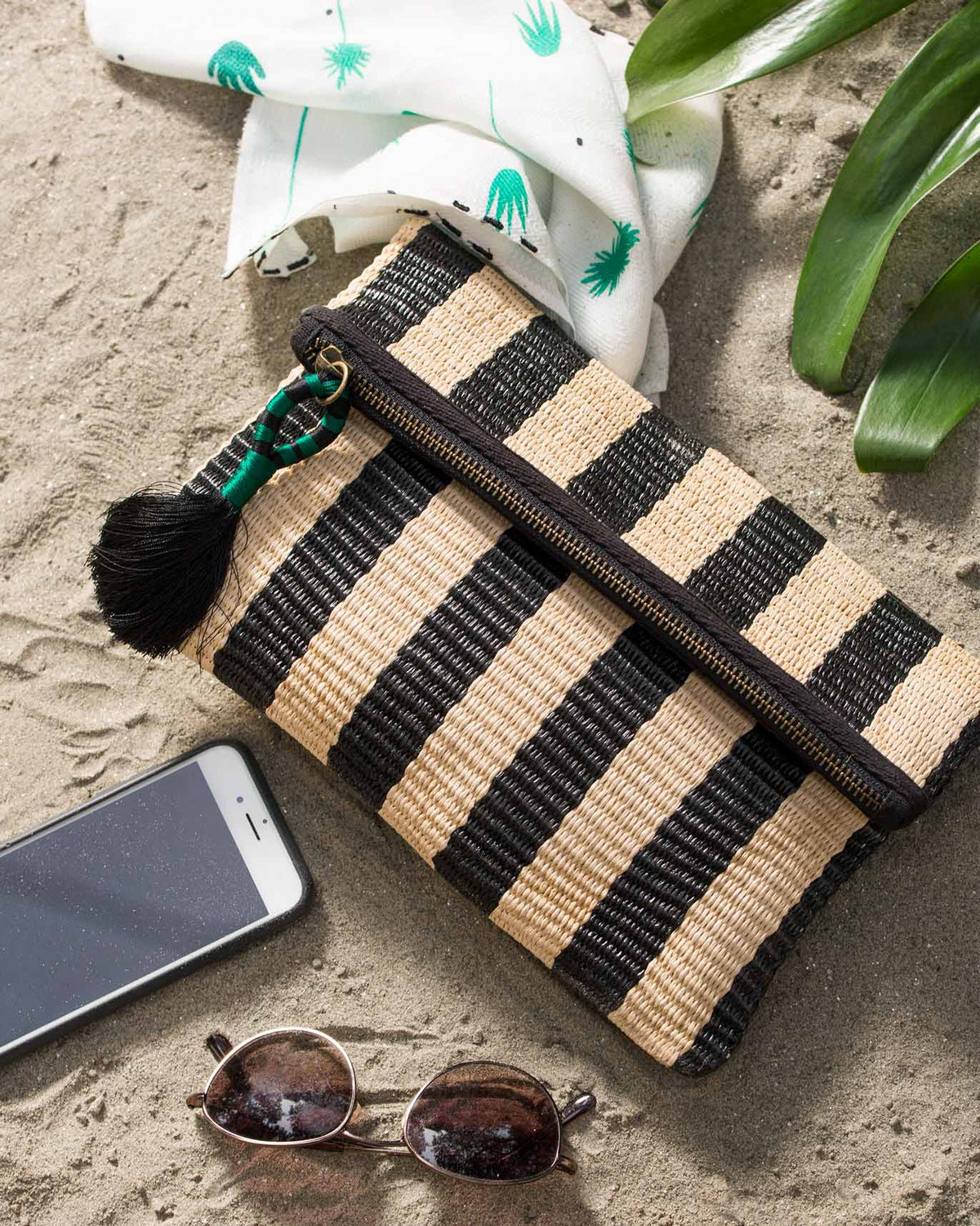 • Hardwearing polyraffia makes a cool stripey foldover clutch for both daytime and nighttime jaunts