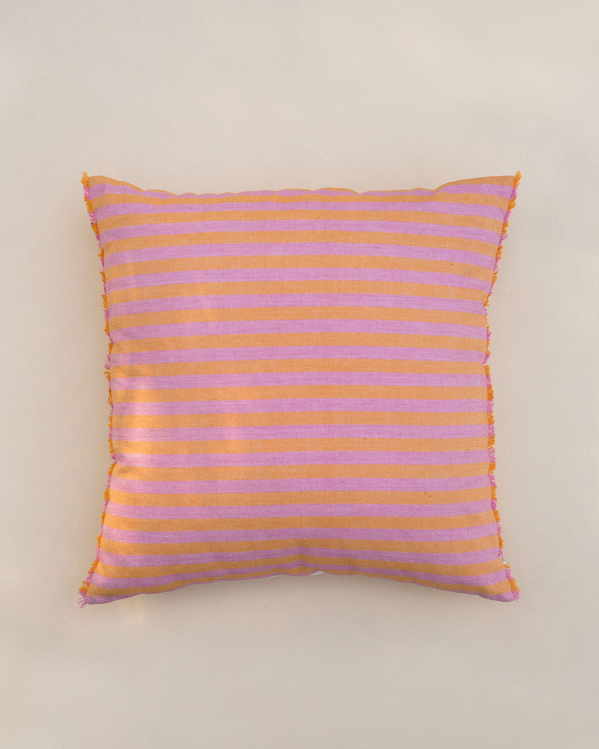 - Inspired by the colours worn by the Banjara women juxtaposed against the desert sand, this is a pink and orange stripe cushion with an envelope enclosure and ties