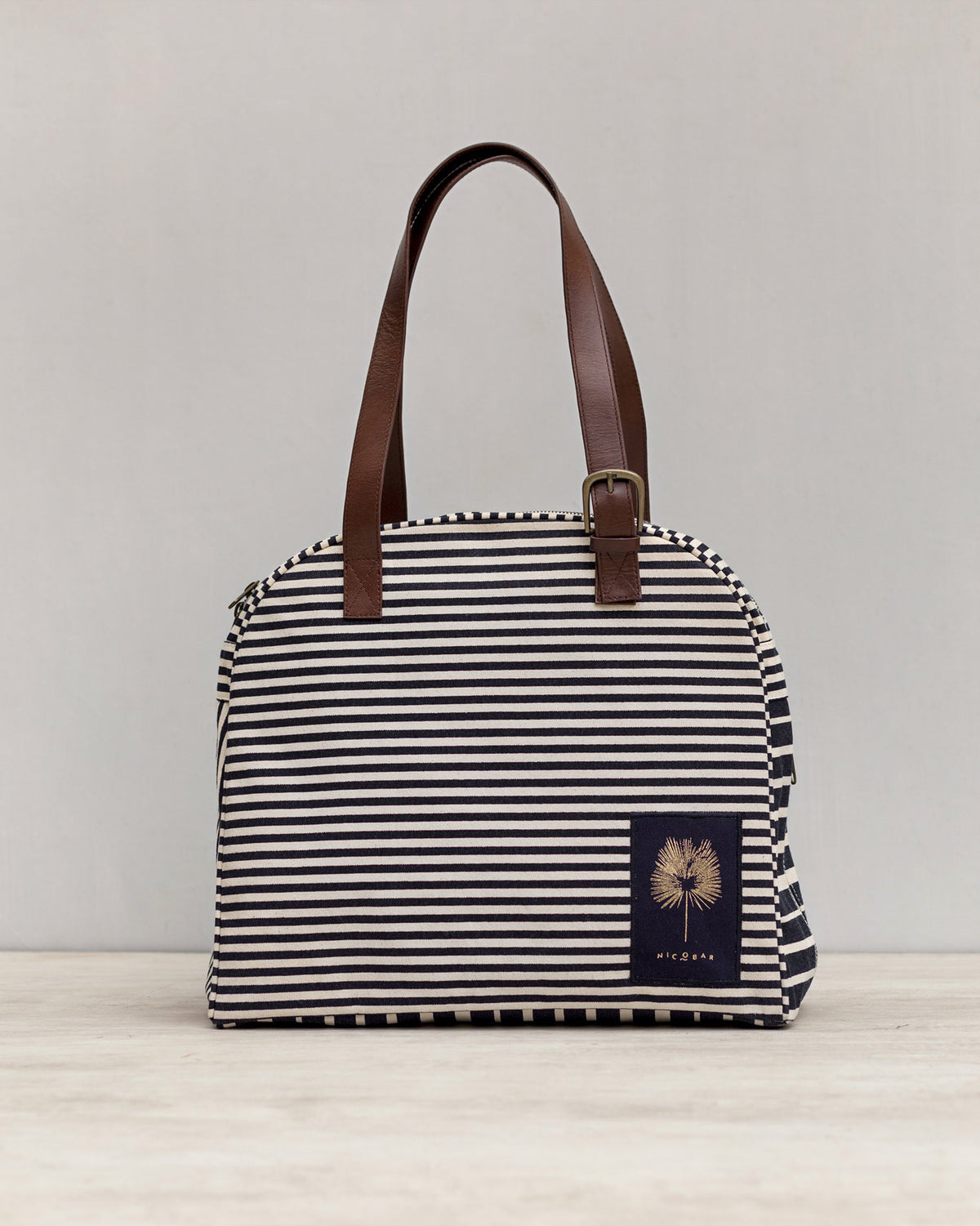 • In hard-wearing canvas, this striped bag packs a punch with a whole bunch of zippers and compartments, and a cheery lining