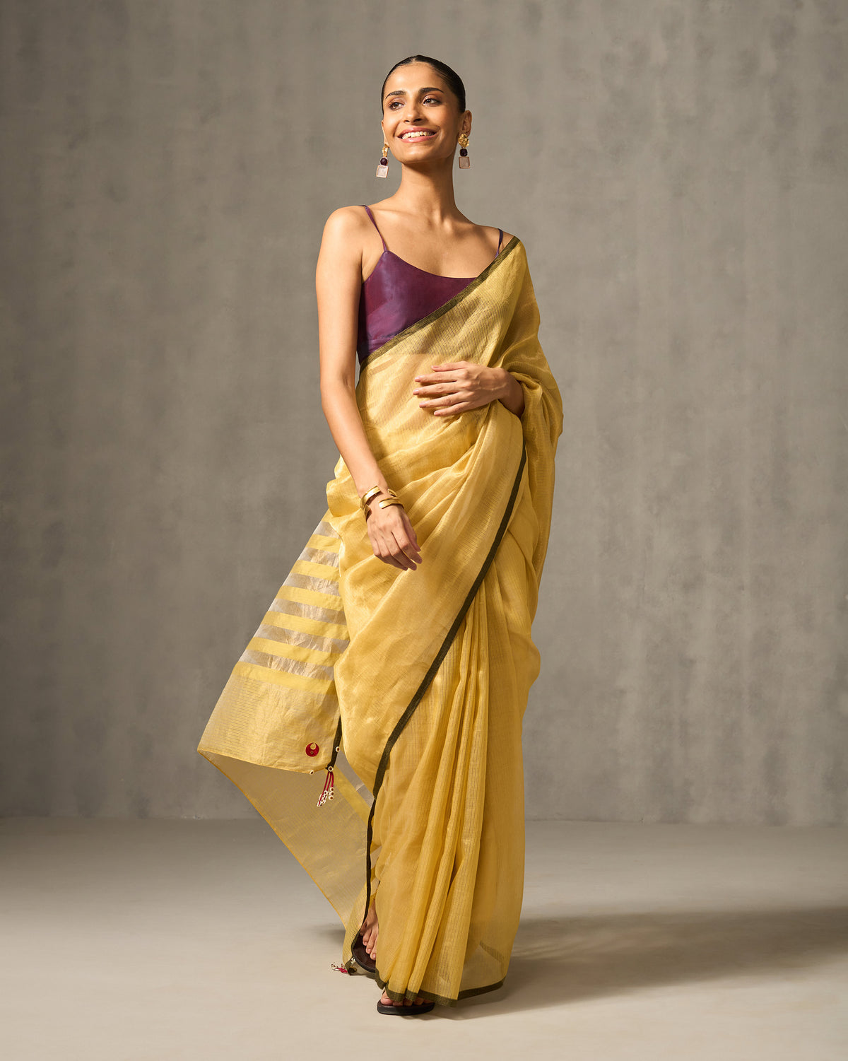 - The sari is finished with a baby hem and playful tassels and comes with a blouse piece.