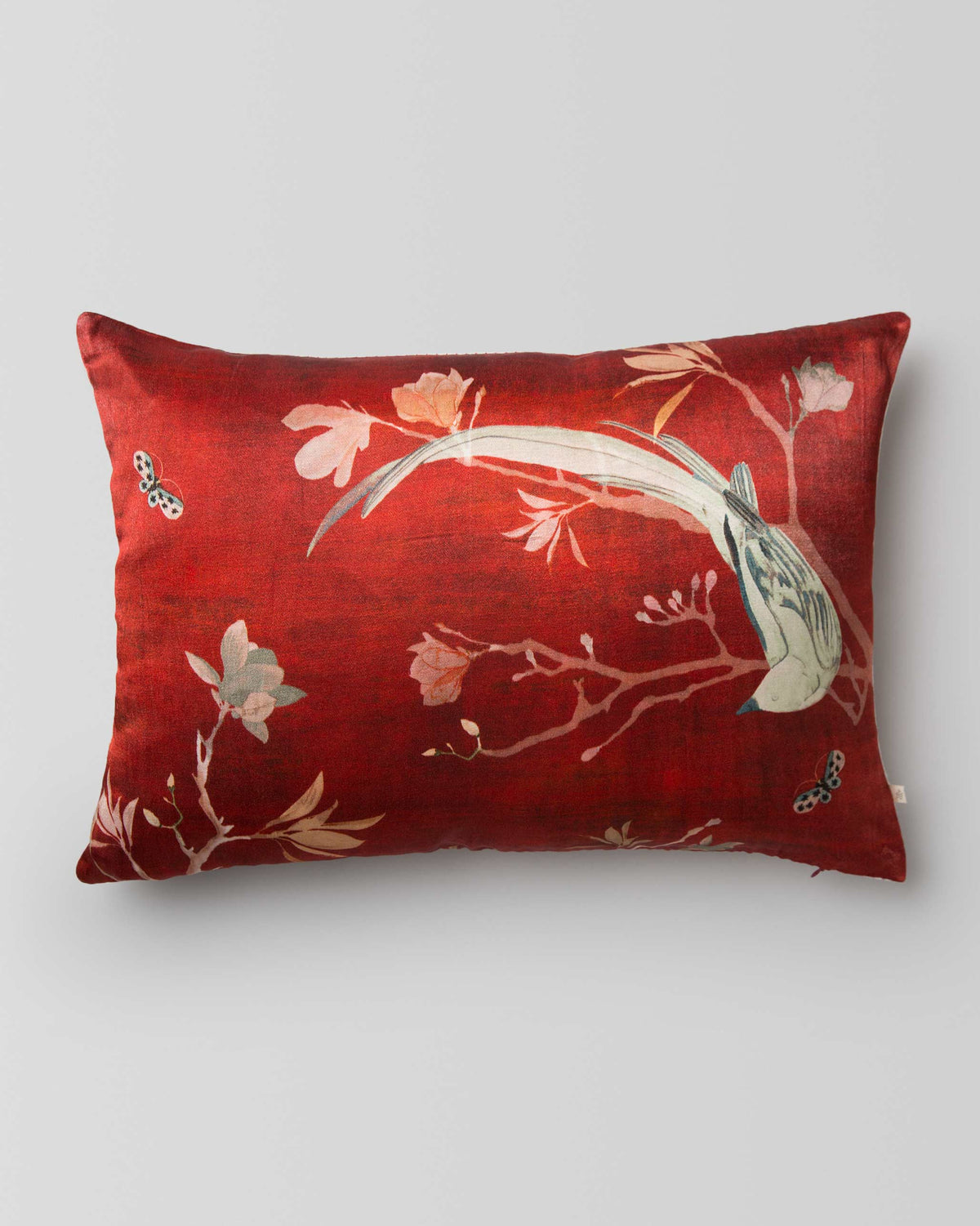 - Fiery red, offset by delicately entwined stalks and leaves, this cushion makes for a standout piece in your living space