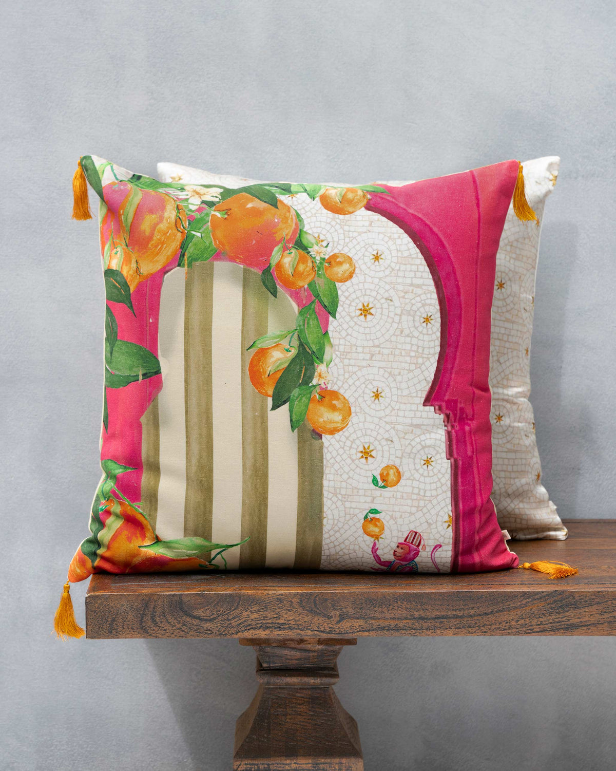 - Abundant tales of Marrakech meet whimsy with the Tangerine Stripes Cushion Cover, with monkeys juggling fruit beneath stripes and an overflowing tangerine tree against a lush backdrop of the city.