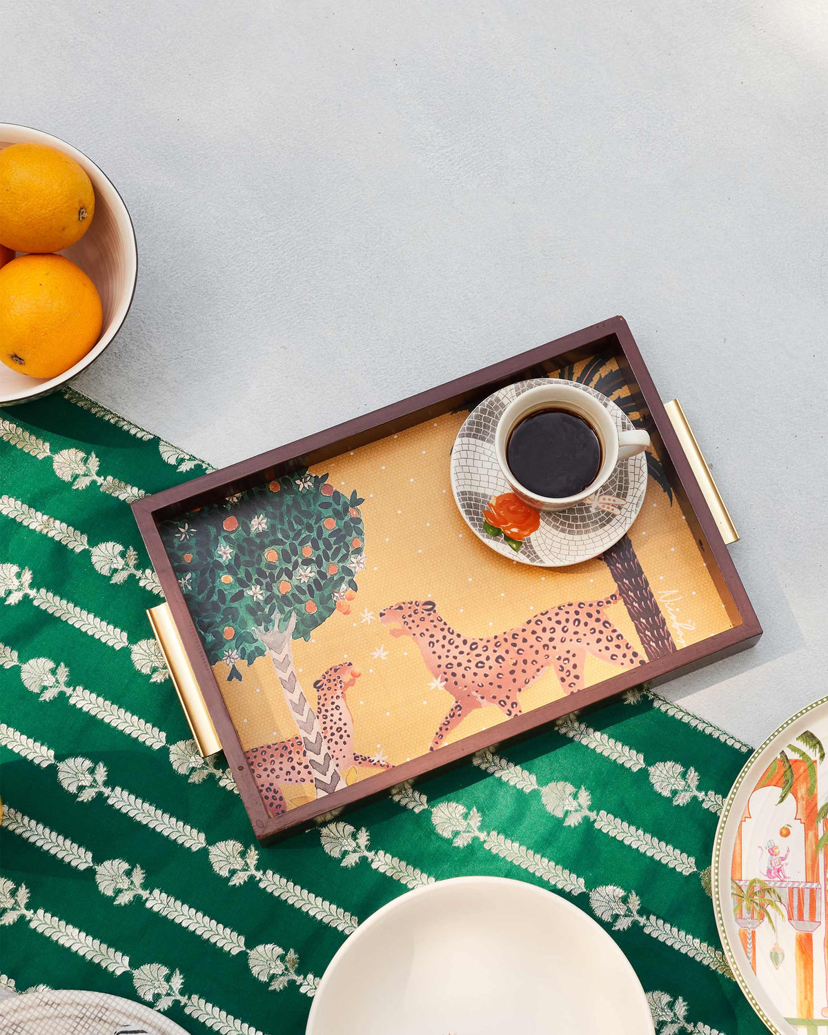 - The tray features whimsical illustrations of leopards prowling beneath palms and lemon trees.