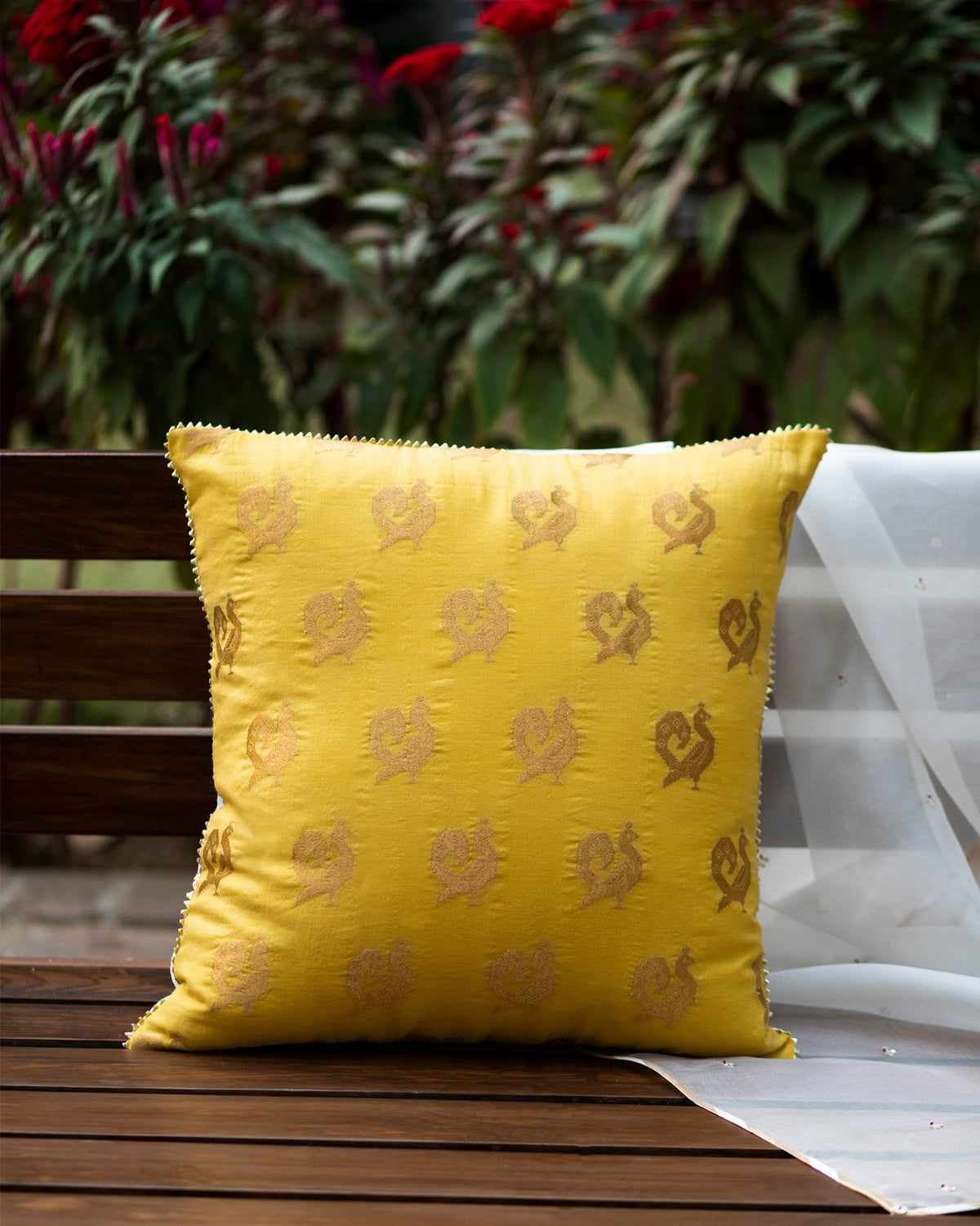 - In buttery chanderi, this cushion cover is all festive chic with a woven gold zari print and a strip of little gota triangles along the edges.