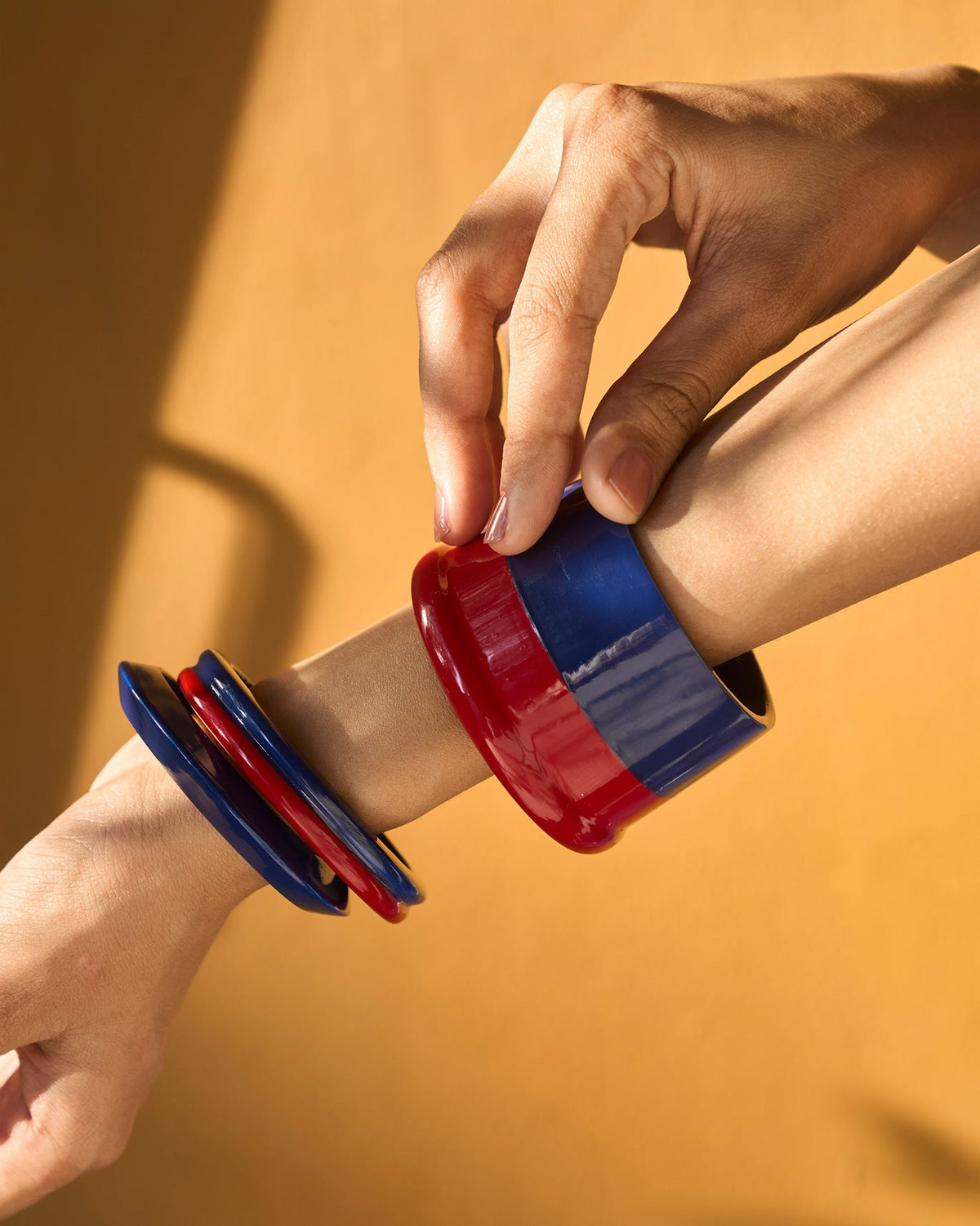 - Crafted from wood with subtle red and blue plating, this bangle looks lovely stacked on one arm as a trio.