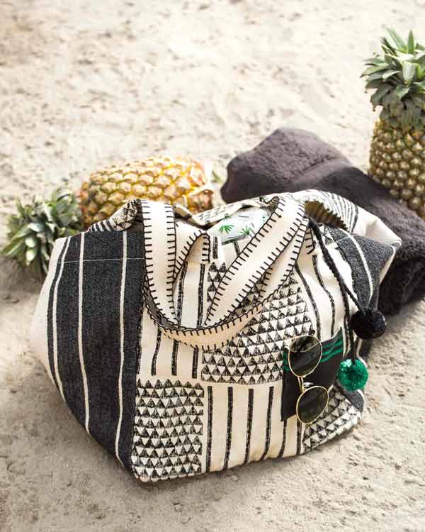 - Great for the beach, this easy-wearing bag in soft cotton features a geometric block print and a patch pocket with our signature ele icon
