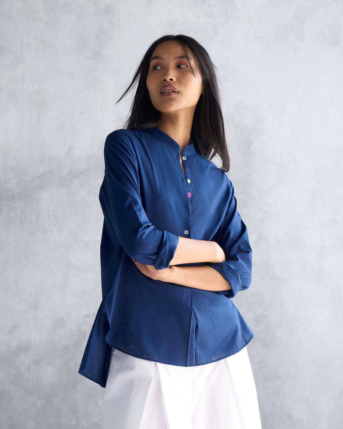 - A set of two of our signature styles, the Mandarin Collar Top and the Basic Pyjamas in indigo, the perfect pair for lounging.
