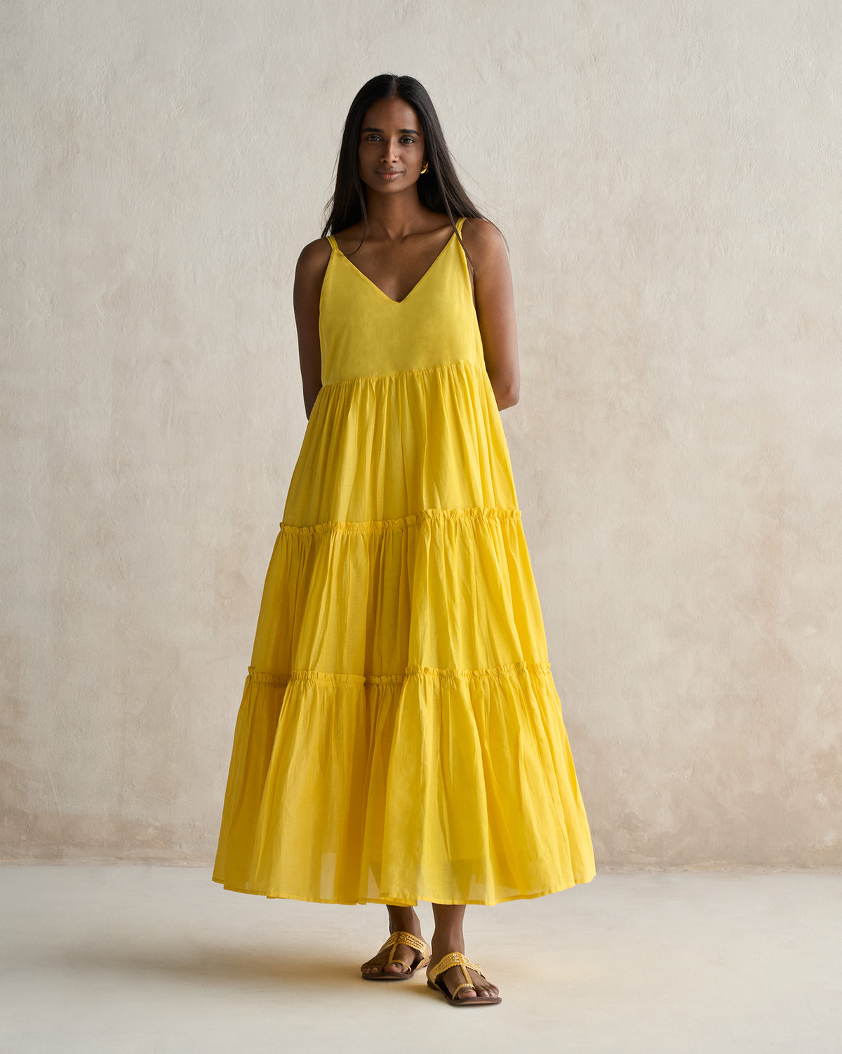- Nicobar’s Tiered dress is crafted in cotton kora.