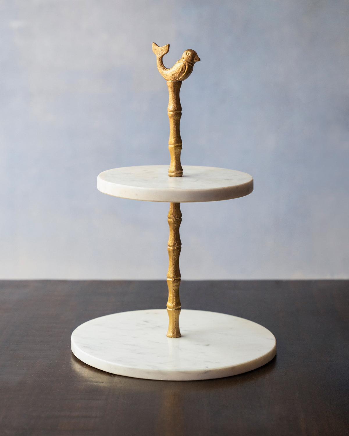 - Elevate your cakes and confections with our smooth marble and aluminium two-tier cake stand