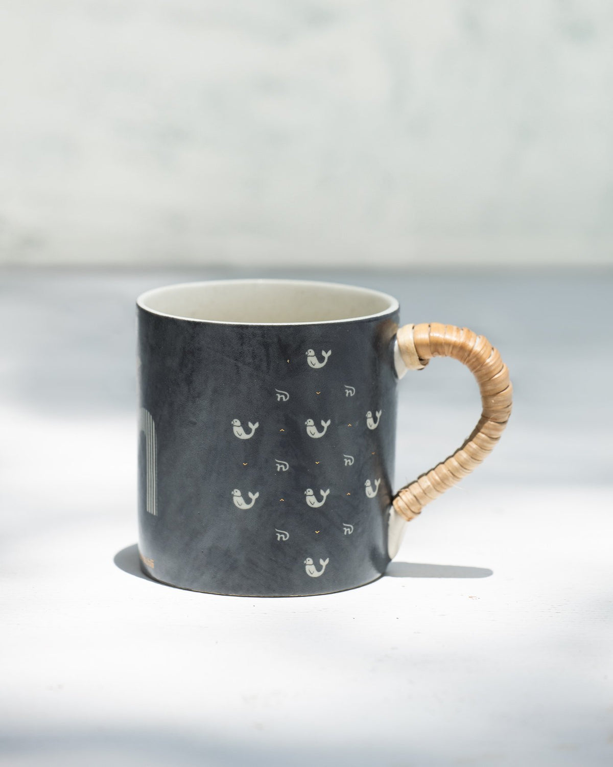 - A grey & gold stoneware mug with a natural wildgrass handle