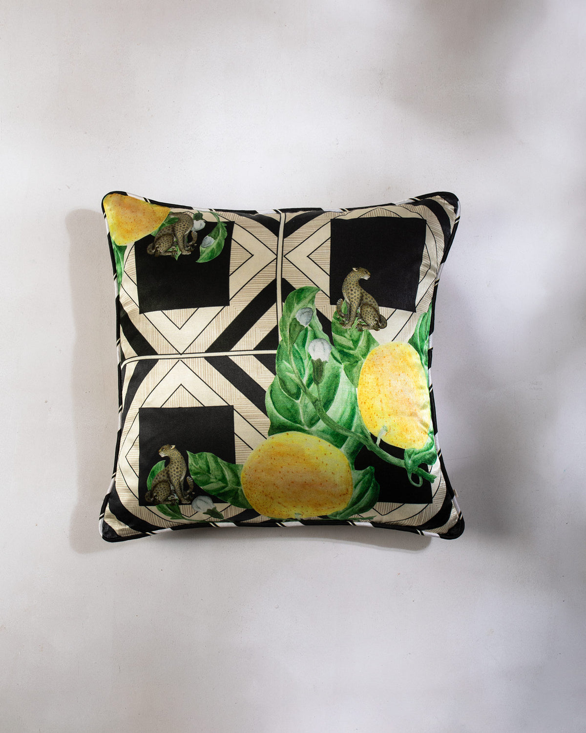 - A charcoal and ivory digi printed cushion with a black & white piping around the corners