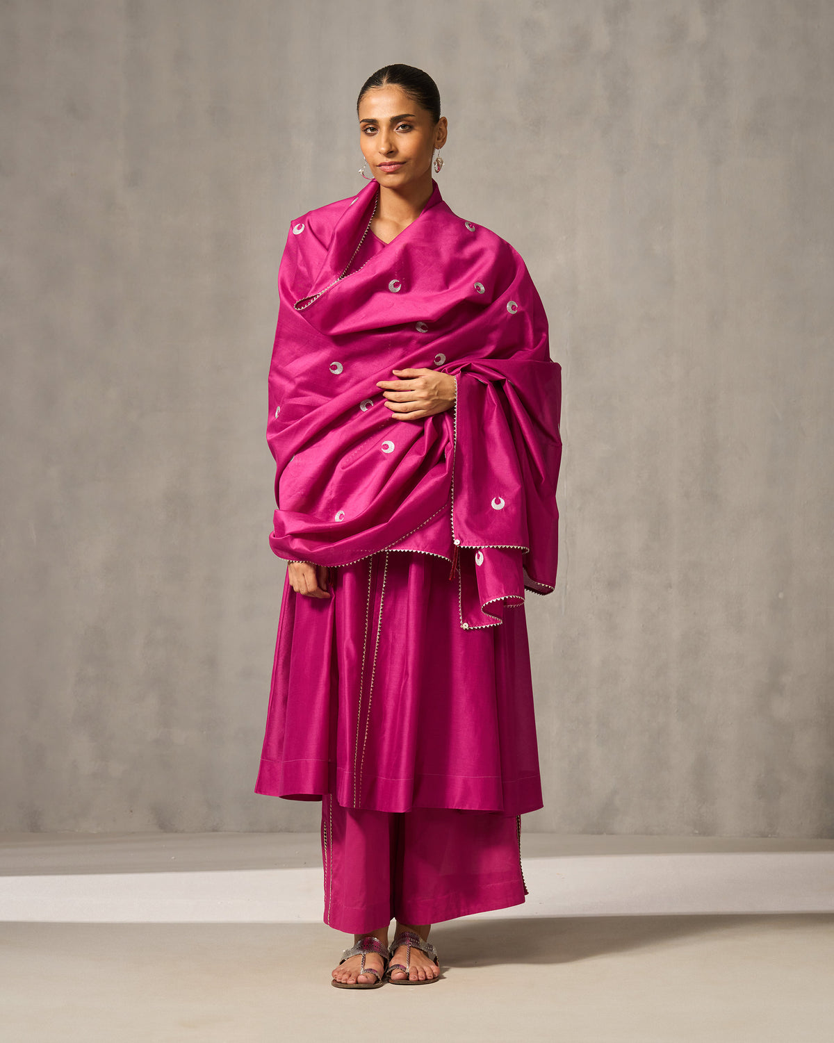 - The Twilight Dupatta features embroidered silver moons on a pink base.