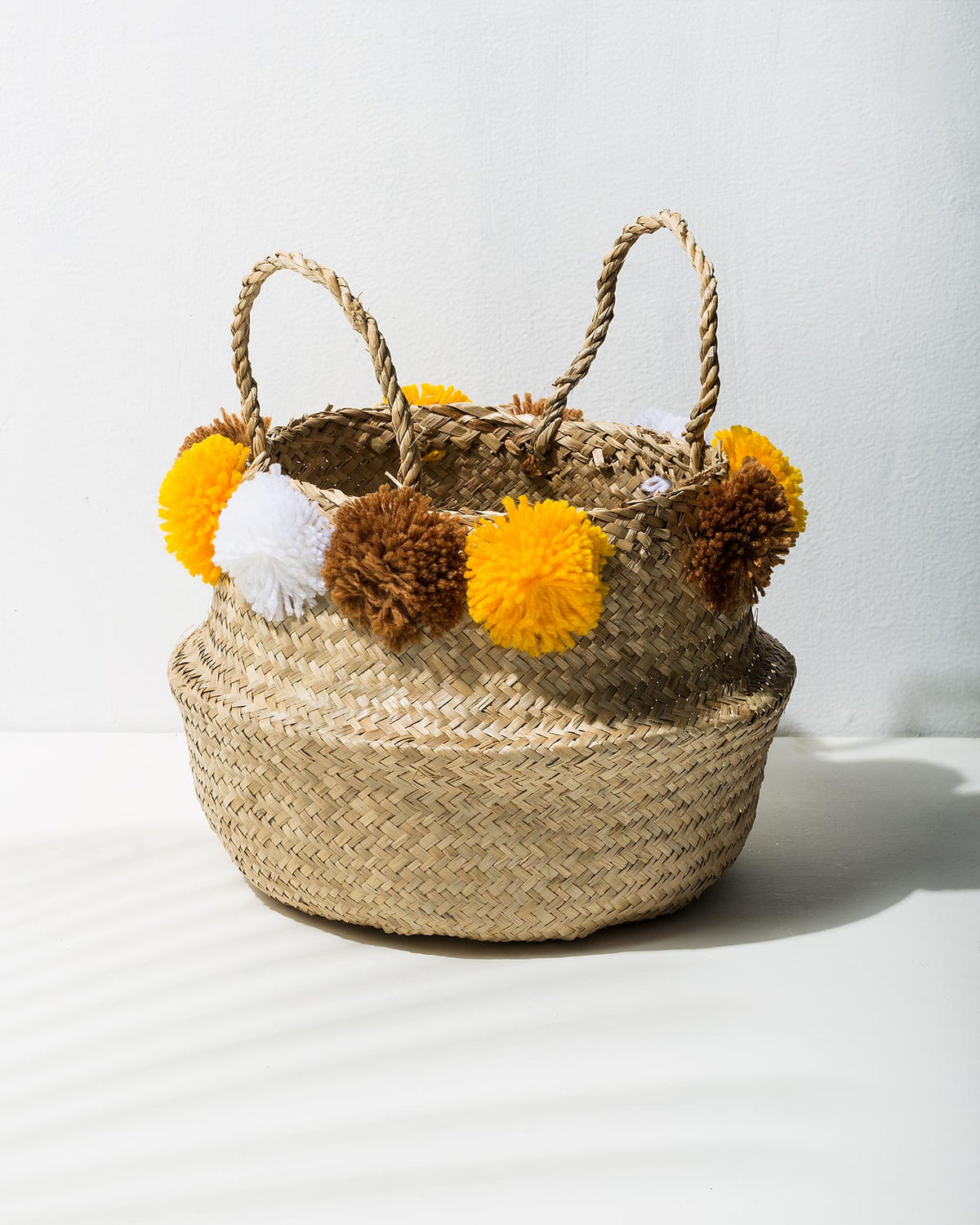 • In a natural hue, featuring grey, yellow, and white pom poms, this bohemian basket is perfect for creating a coastal vibe at home.