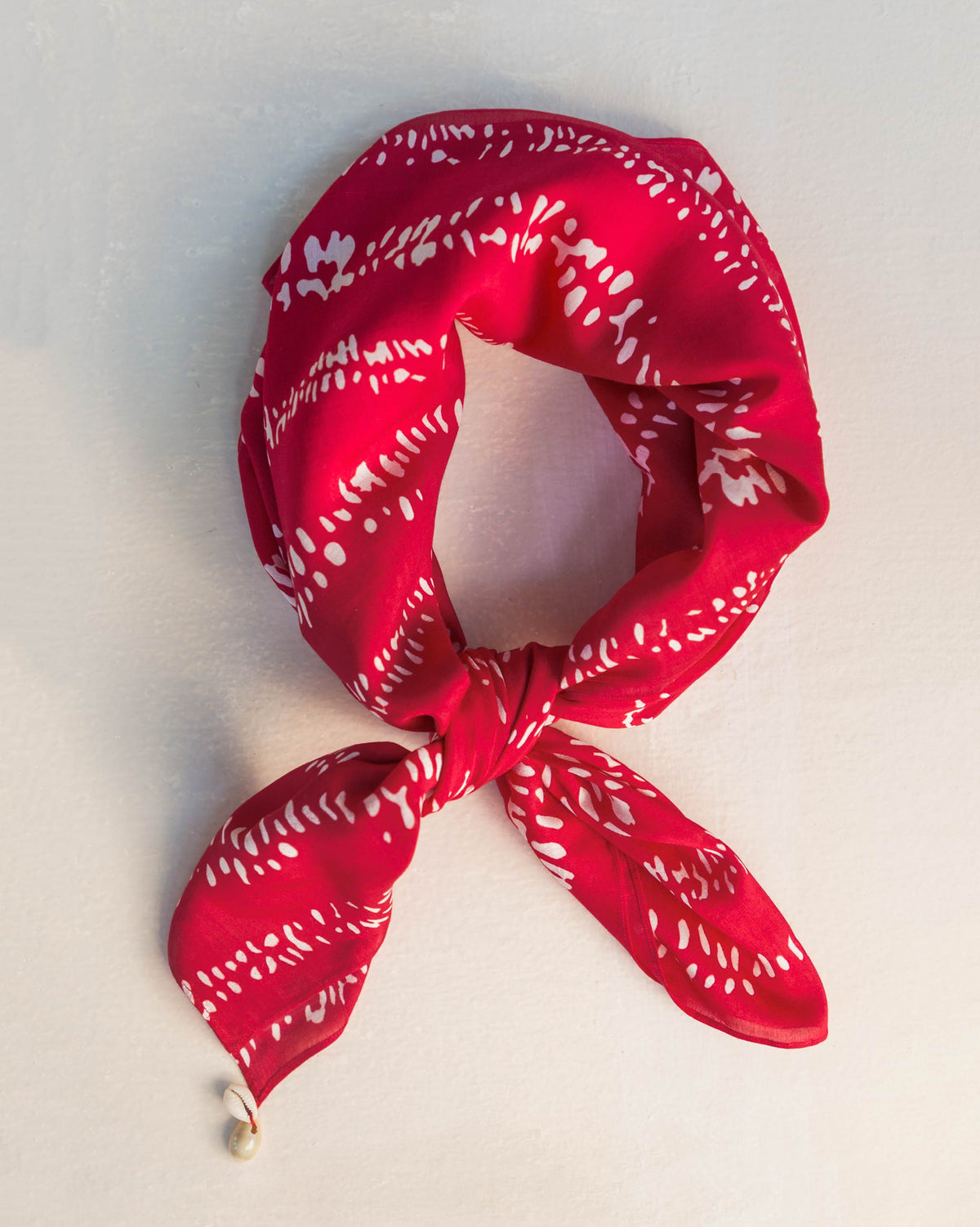- This oblong scarf is bright ruby peppered with an abstract cowri shell motif and pairs well with bold outfits