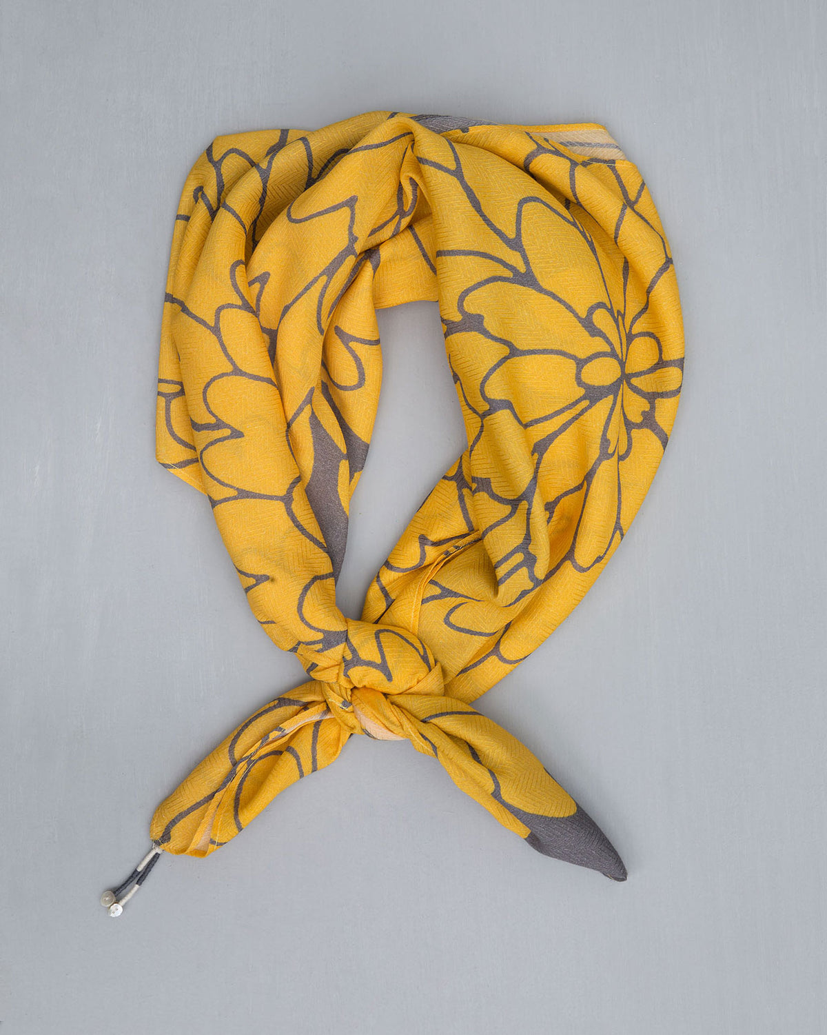 - This bright and bold marigold print on a charcoal base makes for the perfect scarf to wear on a day out or dress up a evening outfit.