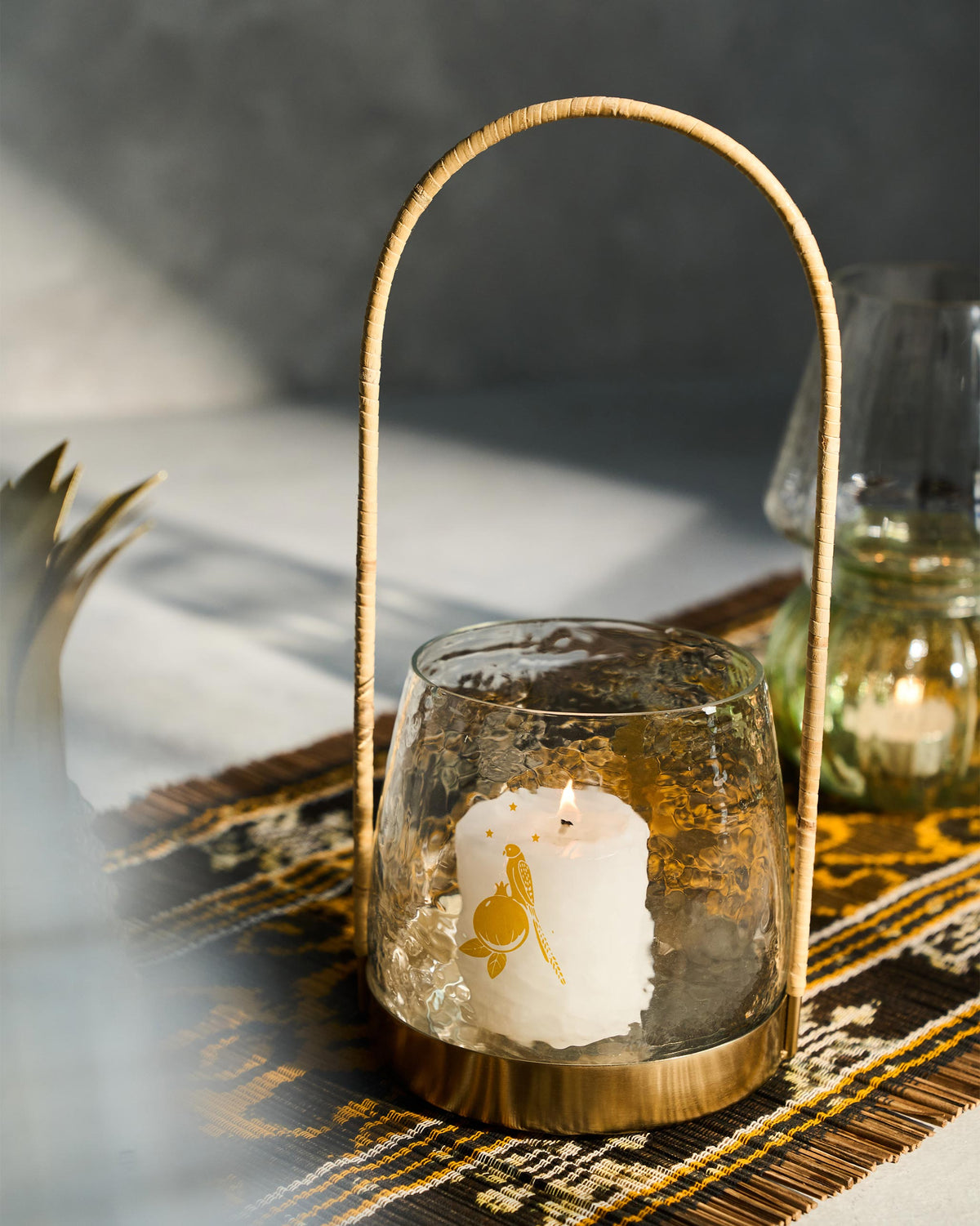 - An eye-catching addition to your indoors, this lantern is crafted glass and finished in gold.