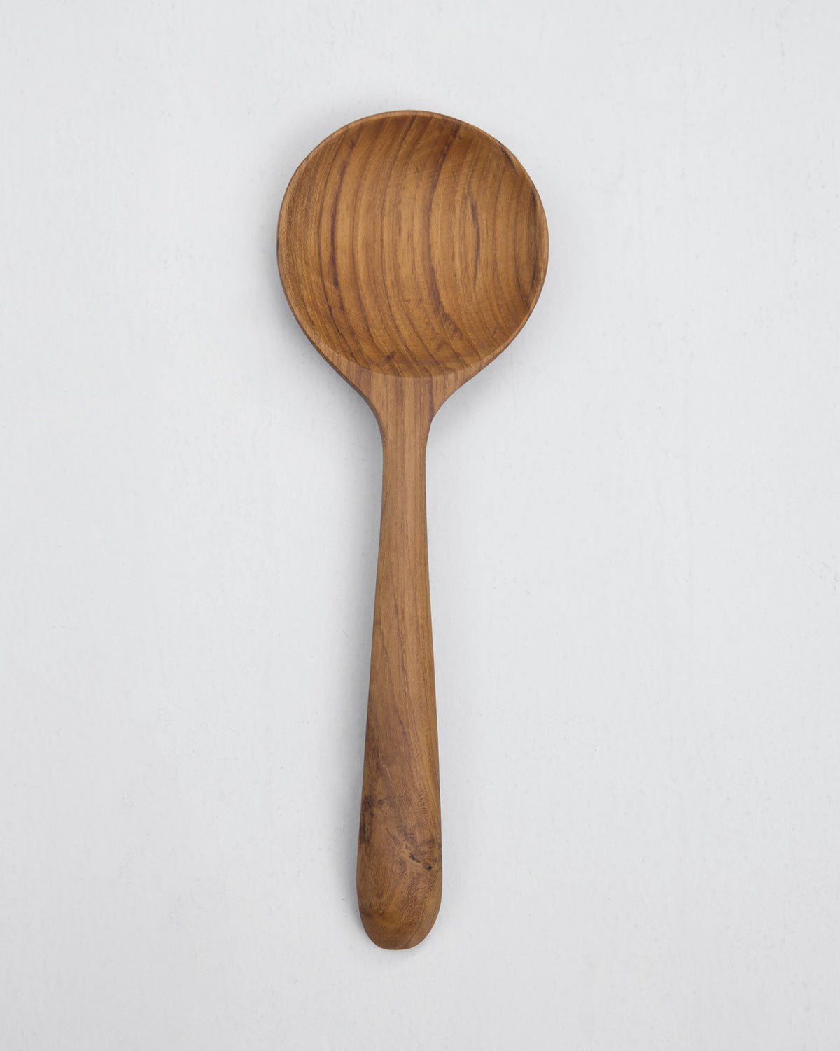 - Fashioned in wood from the roots of the teak tree, this serving spoon will complement any dinner set