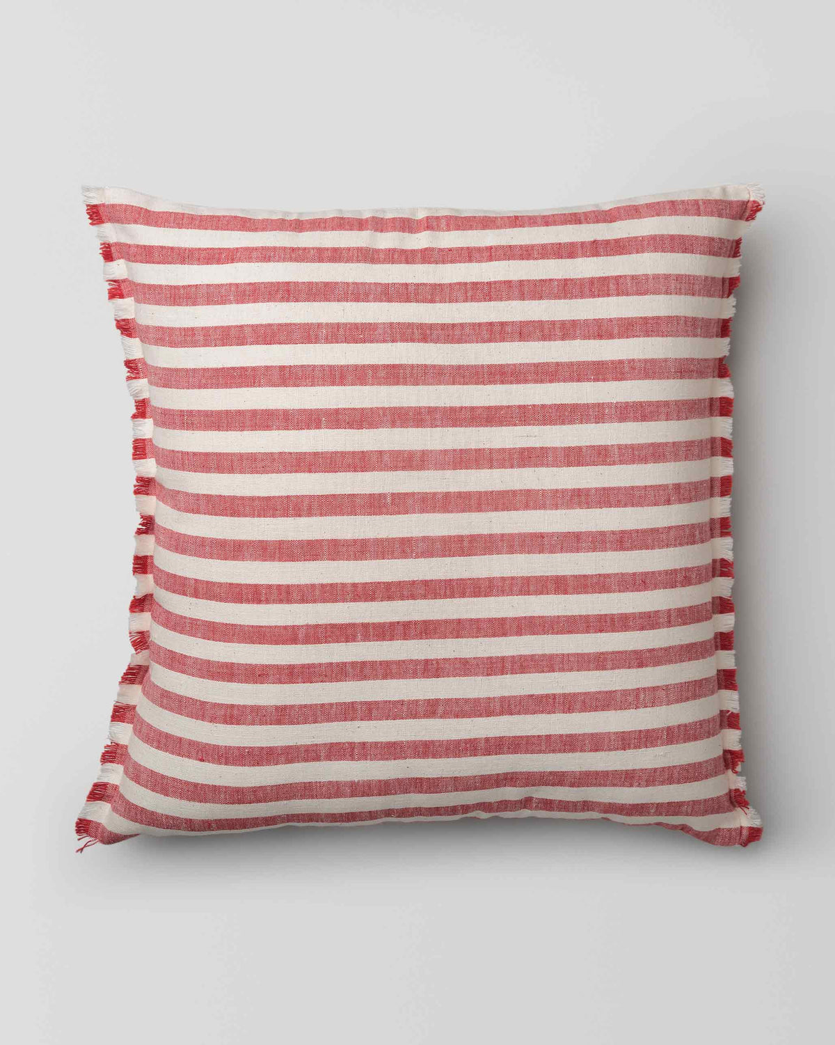 - A play of red and white, this striped cushion features frayed edges and an ivory casement with tie closures