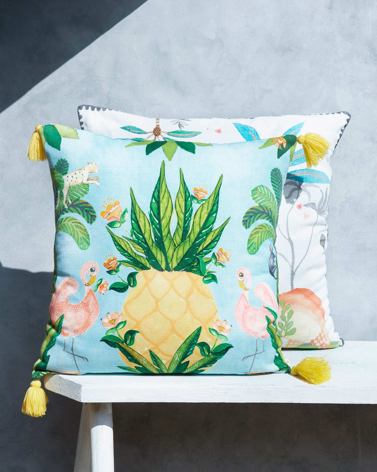 - Bring home a piece of Zanzibar’s vibrant summer with the bright Ananas Cushion Cover. A bold pineapple motif takes centre stage flanked by a pair of regal flamingos. The palms on the side feature a cheeky lemur and Nadira, the traipsing leopard. The back of the cushion features a monochrome striped background, letting you play with the bold print or with classic stripes for your setting.