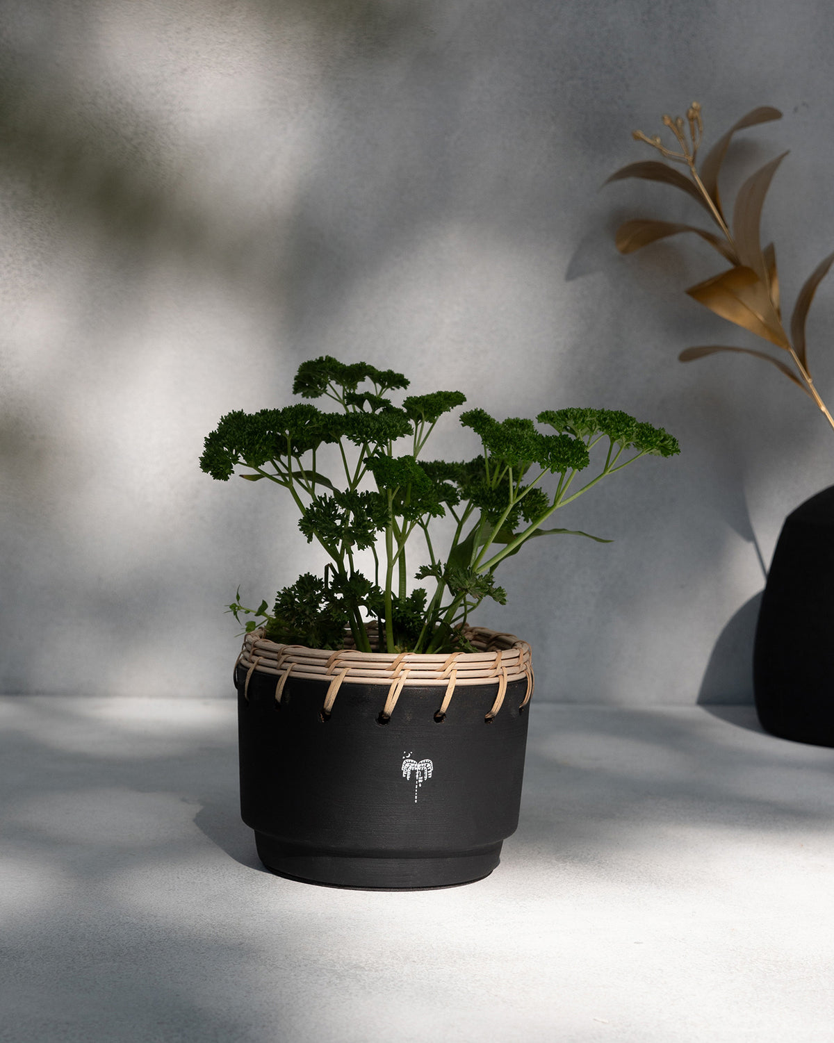 - The planter is crafted in terracotta and rattan.