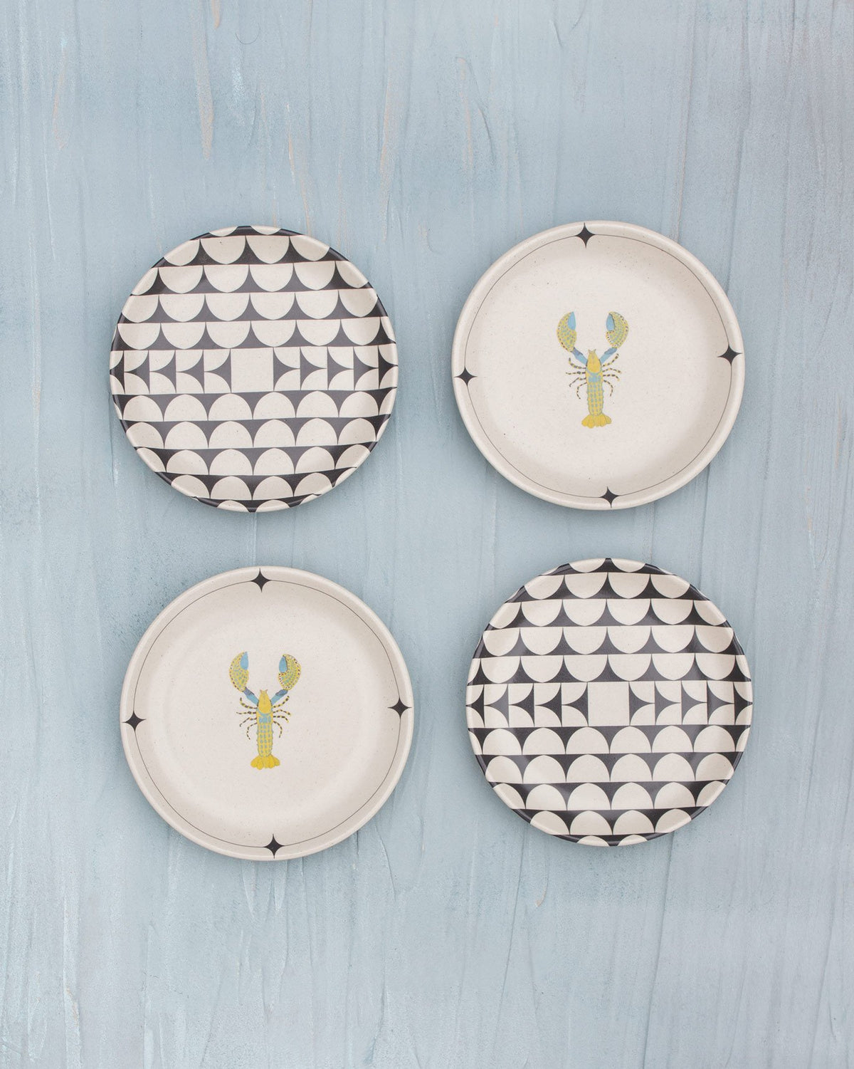• A set of four tea plates featuring patterns and motifs inspired by the African landscape